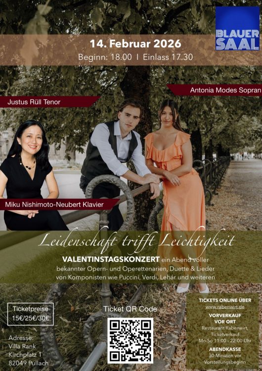 Antonia Modes, Sopran (Stipendiatin 2025 – 2026, Justus Rüll, Tenor, und Miku Nishimoto-Neubert, Klavier, gastieren zum Valentinstag mit bekannten Opern- und Operrettenarien, Duetten und Liedern von Komponisten wie Puccini, Verdi, Lehár und weiteren im Blauen Saal in Pullach.